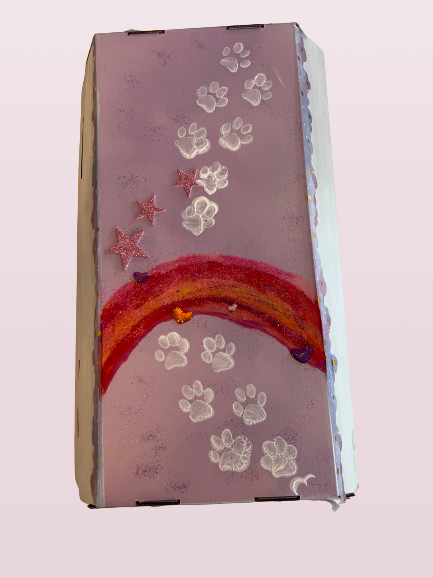 Any pet parent knows, how much it hurts when the time has come that your furry baby has to go. When I experienced saying good bye to my beloved dog, I saw myself confronted in not having the possibility to bury her in a beautiful little coffin, so I had to do it myself. So, I designed it not only outside but also from inside to make my baby feel comfortable when going over the rainbow. I’m more than glad to help you to personalize the bed for the last trip of your furry baby, xo
